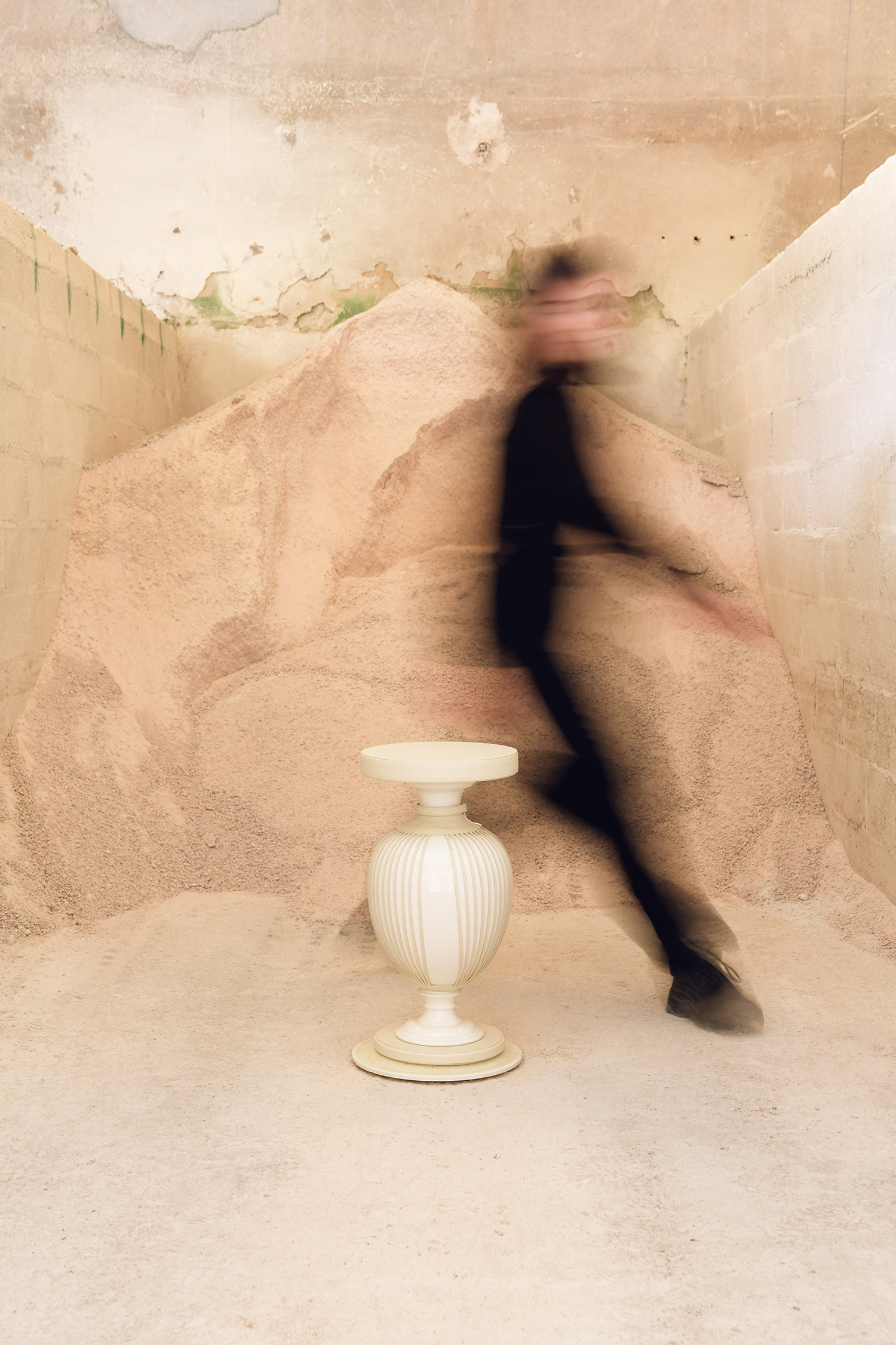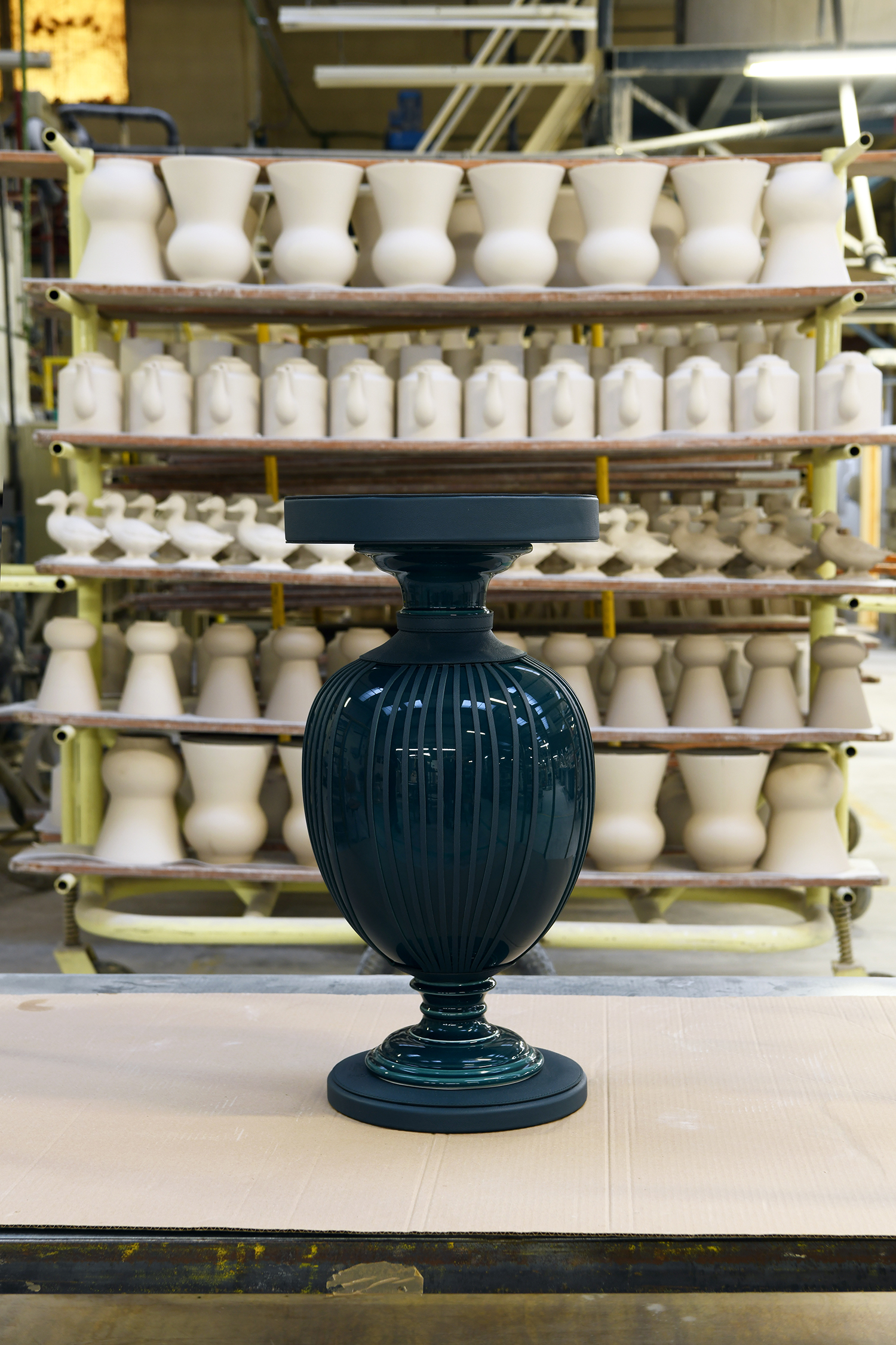 Subtilité du « Corseté », nom donné à la pièce éditée à seulement 8 exemplaires : « Son corset se dégrafe », souligne Hélène Nepomiatzi. Le vase s’habille, se déshabille, comme une personne. Il se contraint ou se libère, selon l’envie. Un double jeu issu d’une résidence dite « tripartite », où la créatrice a sollicité autant les gestes de la maroquinière Noémie Segrétain que les talents internes de la maison Gien. Car chaque pièce a nécessité 26 composants et trois cuissons, avant de passer entre les mains d’une trentaine de maîtres faïenciers. De la matière première - sables, argiles, kaolin - aux œuvres terminées, sans oublier les moules, les émaux et les pigments, toutes les étapes de fabrication ont eu lieu à Gien, selon des formules et autres processus qui restent secrets. Quant à l’assise, elle s’inscrit également dans une logique de réemploi, en intégrant des éléments mécaniques issus de la production. Circuit court toujours.
